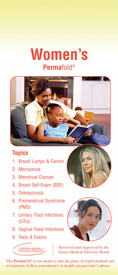Permafold This 12-panel guide is printed on “coffee proof” plastic for durability. Topics include breast lumps & cancer, menstrual cramps, breast self-exam, osteoporosis, PMS, urinary tract infections, vaginal yeast infections, and tests and exams. Click here to view a sample |