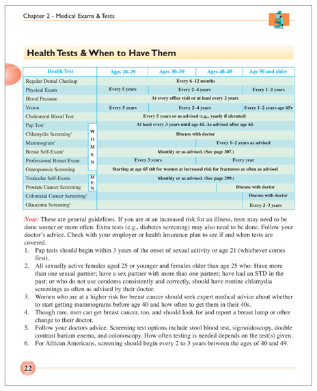 The “Health Tests & When to Have Them” chart provides basic guidelines for healthy individuals who are experiencing no symptoms of illness. If you have an increased risk or family history of a particular illness, testing may need to be done earlier or more often. The National Cancer Institute recommends that routine mammograms begin at age 40. For women at high risk, however, i.e., women who have a mother or sister who has breast cancer, it would be advisable to have a first mammogram ten years earlier than the age at which their mother or sister developed breast cancer. That means that if their mother was 42 at the time of diagnosis, they should have their baseline mammogram at 32. Recommendations for when and how often to have mammograms vary from different organizations. Women should check with their health care provider for his or her recommendation for mammograms and find out if and when mammograms are covered by their health plan. This applies to other tests, as well, for both women and men.
