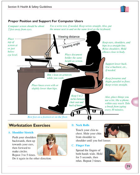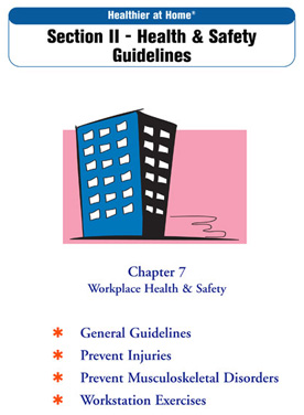 Chapter 7 is “Workplace Health & Safety.” Here you will find general guidelines to stay safe at work and ways to prevent common workplace injuries and musculoskeletal injuries like carpal tunnel syndrome. Sample workstation exercises are given on pages 59 and 60.