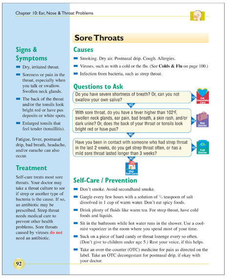 The next part is headed “Questions to Ask.” Answering “yes” or “no” to these questions will help you determine whether you should get immediate care, see your doctor, call your doctor, or use self-care. The final part lists a number of self-care / prevention tips for the condition, in this case for sore throats.