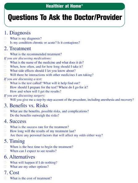 Be assertive about your needs. Being accurate both when you report information to your doctor and when you record information from your doctor will help improve communication with him or her, minimize the time (and hopefully, the money) you will need to spend, and provide the best results in taking care of your health. After all, when 70% of correct diagnoses depend solely on what you tell your doctor, it is to your advantage to give him or her all the information you can and as accurately as possible.
