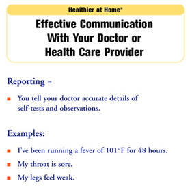 “Reporting” refers to telling your doctor or health care provider accurate details of self-tests and observations that you have kept track of. It means taking the responsibility of being your own reporter - asking and answering for yourself the who, what, when, why, and how questions in the same way that reporters probe and cover a news story.