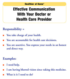 “Responsibility” means that you are in charge of your health and need to be accountable for the decisions you make regarding your health care needs. Being assertive when talking with your doctor or health care provider is a big part of this. Assertiveness means letting your doctor know what your needs are in an honest and direct way. It involves “I” messages, such as “I need help,” or “I am having blurred vision since taking this medicine,” or “What do I need to do?”