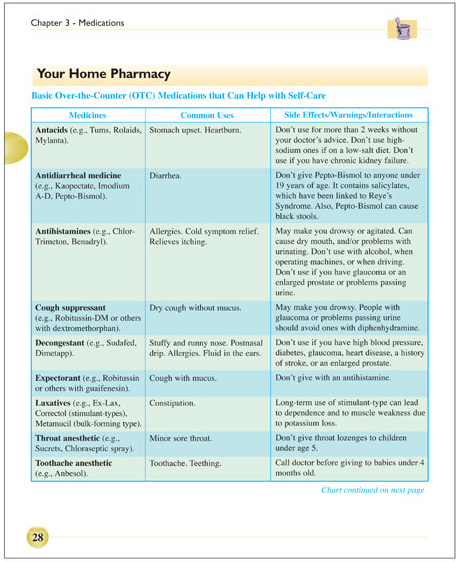 Your home pharmacy chart includes: Over-the-counter medicines; common uses for them; possible side effects; warnings; and interactions with other medicines, foods, etc. You may choose not to stock some of these items due to allergies or lack of need. Also, individual circumstances may require that you need items that are not listed.