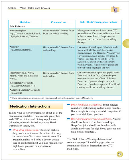 Also, note that it is important to read the labels on all over-the-counter medicines. Even though they can be bought without a prescription, they can cause harm if not taken appropriately or when warnings are not heeded. One example that comes to mind is the association of aspirin with Reye’s Syndrome in children. You will see this in the “Side Effects / Warnings / Interactions” column next to aspirin under “Pain Relievers.” It is also a good idea to ask your doctor or health care provider which pain reliever(s), as well as, other OTC medicines are okay for you to take.